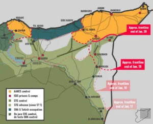 La série d’événements actuelle a commencé début janvier, lorsque deux quartiers kurdes historiques d’Alep — Sheikh Maqsoud et Ashrafieh — ont été brutalement attaqués par la nouvelle armée du gouvernement de transition syrien. Ces quartiers, bien que géographiquement isolés de la DAANES, étaient autonomes, à l’instar d’une grande partie du Rojava, depuis plus d’une décennie. Les violences ont provoqué le déplacement de 150 000 Kurdes et Syriens, les assaillants ayant tué au moins 24 personnes et commis de nombreux actes de brutalité. Dépassées par les événements, les FDS ont négocié un cessez-le-feu et se sont retirées d’Alep. Ce cessez-le-feu allait être le premier d’une série d’accords non respectés. Les forces de Jolani ont rapidement élargi leur offensive, tendant des embuscades aux FDS alors qu’elles se retiraient. Les FDS et leur projet plus large d’autonomie se sont désintégrés à mesure que les populations arabes et les chefs tribaux prenaient leurs distances, dans l’espoir d’éviter la colère de Damas.