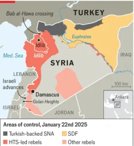 Peu après, le 8 décembre, al-Assad a fui la Syrie pour Moscou. Le chef du HTS, Mohammed al-Jolani, a rapidement pris sa place, recevant des visites diplomatiques et des journalistes au palais présidentiel de Damas. Ne se lassant pas de cette mascarade, il a troqué sa tenue de guérillero vert olive contre un costume et une cravate de politicien. Pour parachever sa transformation, il a également cessé d’utiliser son nom de guerre djihadiste, le remplaçant par son nom légal, Ahmed al-Sharaa, avant de revendiquer finalement la présidence syrienne.2